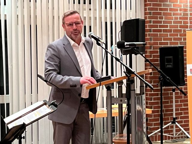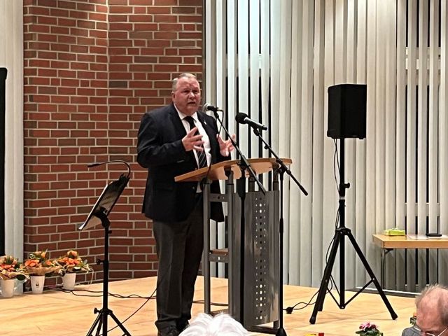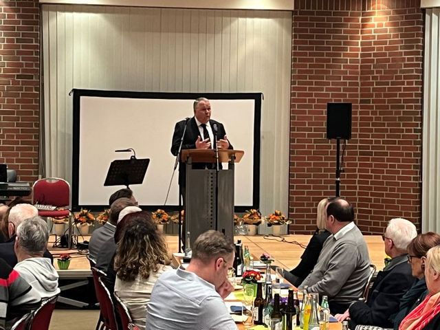 Kurz vor dem Hauptredner stellte der Schermbecker Pfarrer Daniel Wiegmann kurz das „Netzwerk Schermbeck“ vor. Mehr als 600 Euro Spenden wurde dafür an diesem Abend gesammelt. Dann trat Josef Hovenjürgen ans Rednerpult, Landtagsabgeordneter unter anderem für die Nachbargemeinde Dorsten und seit der Landtagswahl Parlamentarischer Staatssekretär im NRW-Heimatministerium. In seiner Rede verurteilte er unter anderem die Übergriffe auf Rettungskräfte und betonte die Bedeutung von Zusammenhalt und Respekt in der sich im Wandel befindenden Welt, Motto: anpacken anstatt nur zu fordern.